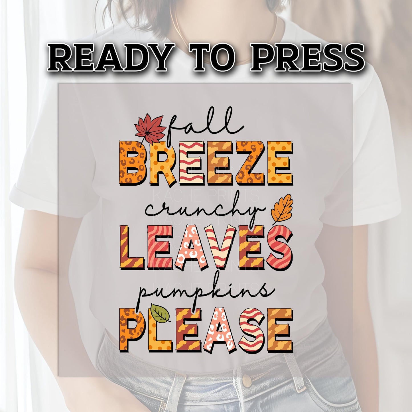 Fall DTF Transfer Ready For Press, Fall DTF Transfers, Autumn DTF Transfer, Fall Transfers, Fall Breeze Crunchy Leaves Pumpkins Please